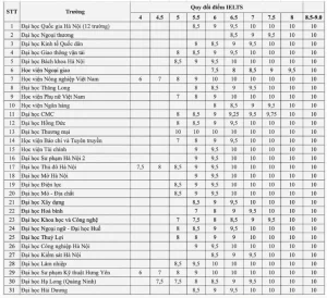 Còn lại hầu hết các trường yêu cầu từ 5.0 IELTS, phổ biến quy đổi thành 7-8,5/10 điểm môn tiếng Anh. Các trường quy đổi thành điểm 10 dao động từ 6.5 đến mức cao nhất 8.5 IELTS.