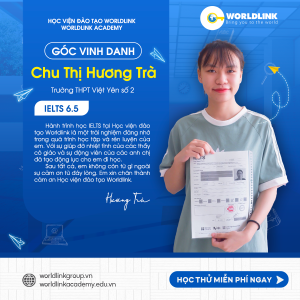 "Hành trình học IELTS tại Học viện đào tạo Worldlink là một trải nghiệm đáng nhớ trong quá trình học tập và rèn luyện của em. Với sự giúp đỡ nhiệt tình của các thầy cô giáo và sự động viên của các anh chị đã tạo động lực cho em đi học. Sau tất cả, em không còn từ gì ngoài sự cảm ơn từ đáy lòng. Em xin chân thành cảm ơn Học viện đào tạo Worldlink"